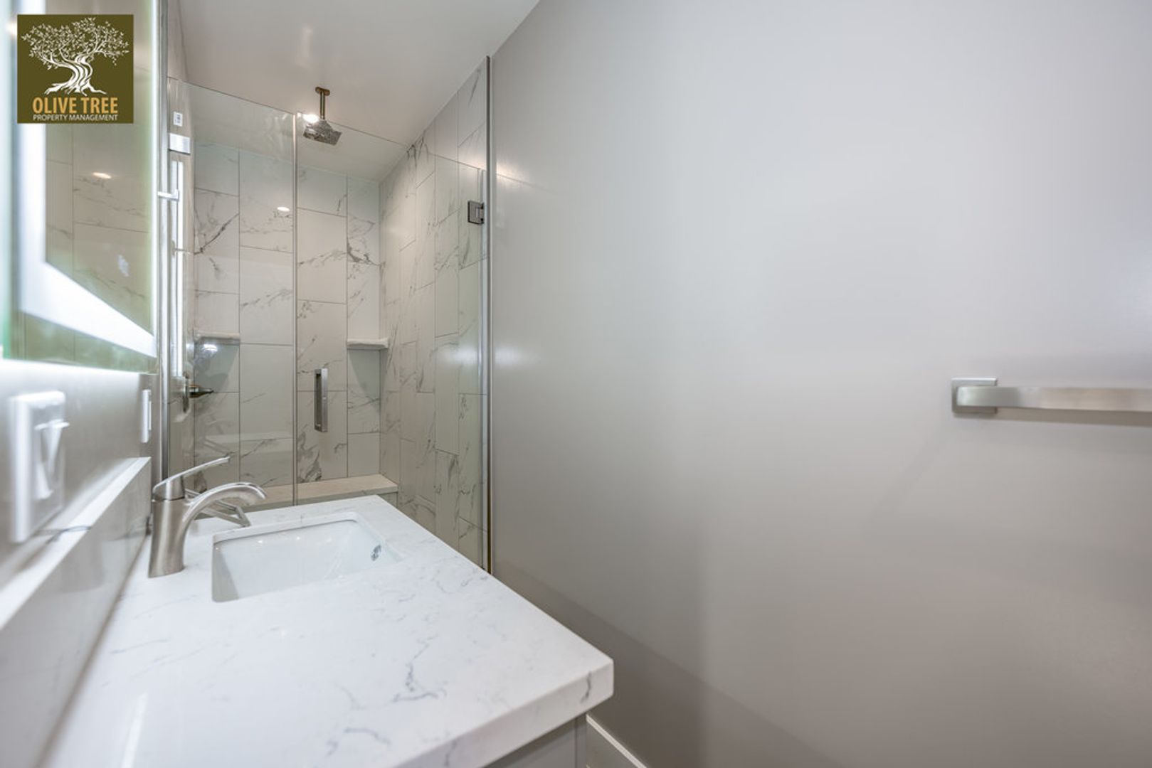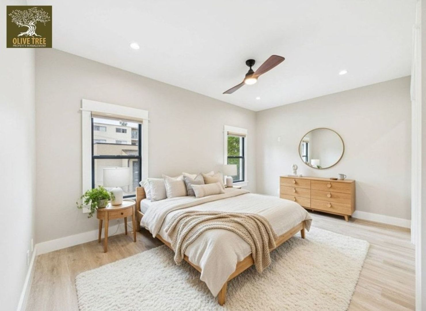 The primary suite offers a serene retreat with a luxurious bathroom featuring an oversized walk-in shower and beautifully appointed finishes. High-end laminate flooring, custom window shades, natural light, and all-new windows enhance the elevated feel throughout.