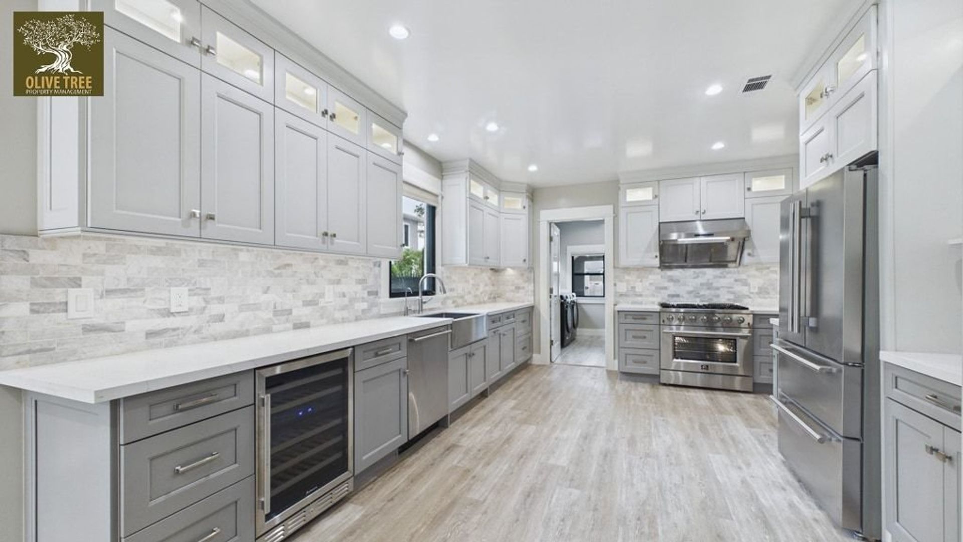 This ground-level unit within a newly renovated duplex has been completely redesigned from the ground up, featuring premium finishes, modern systems, and a thoughtfully open floor plan. Offering 2 bedrooms and 2 bathrooms, with approx. 1,600SF, the home welcomes you with a warm living room and custom fireplace that seamlessly connects to an oversized dining area and a stunning chef-inspired kitchen. Designed for both entertaining and everyday living, the kitchen is equipped with high-end appliances, under-counter wine fridge, abundant cabinetry, and generous counter space.