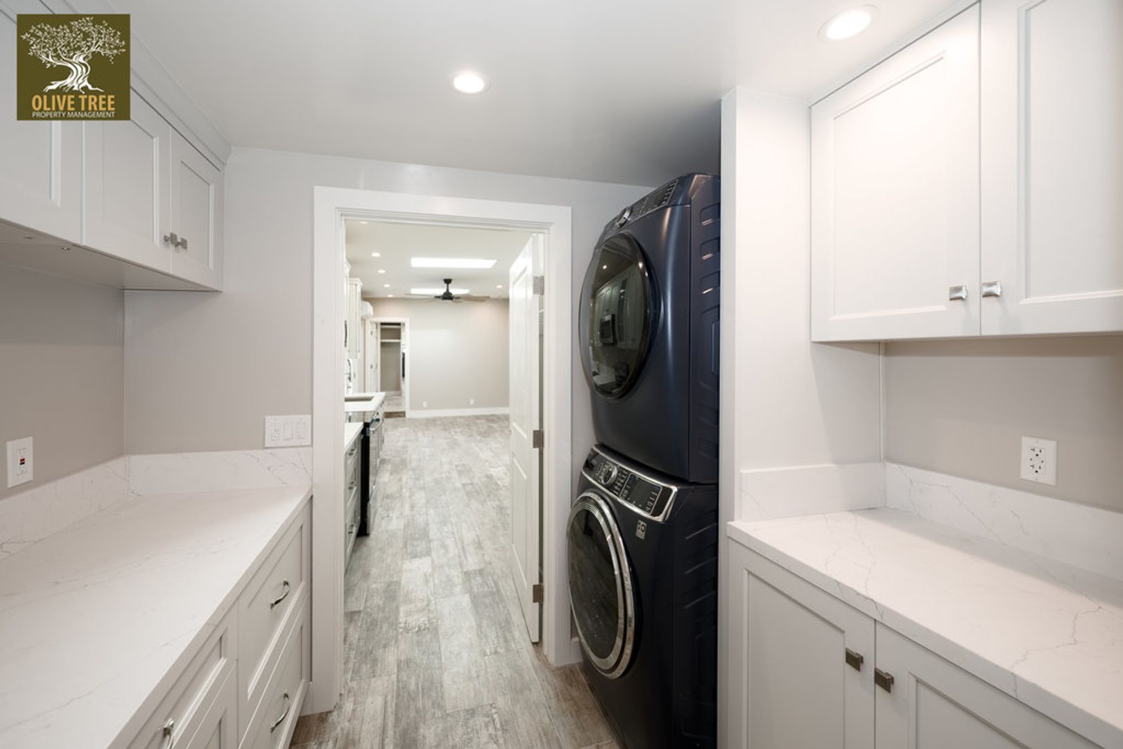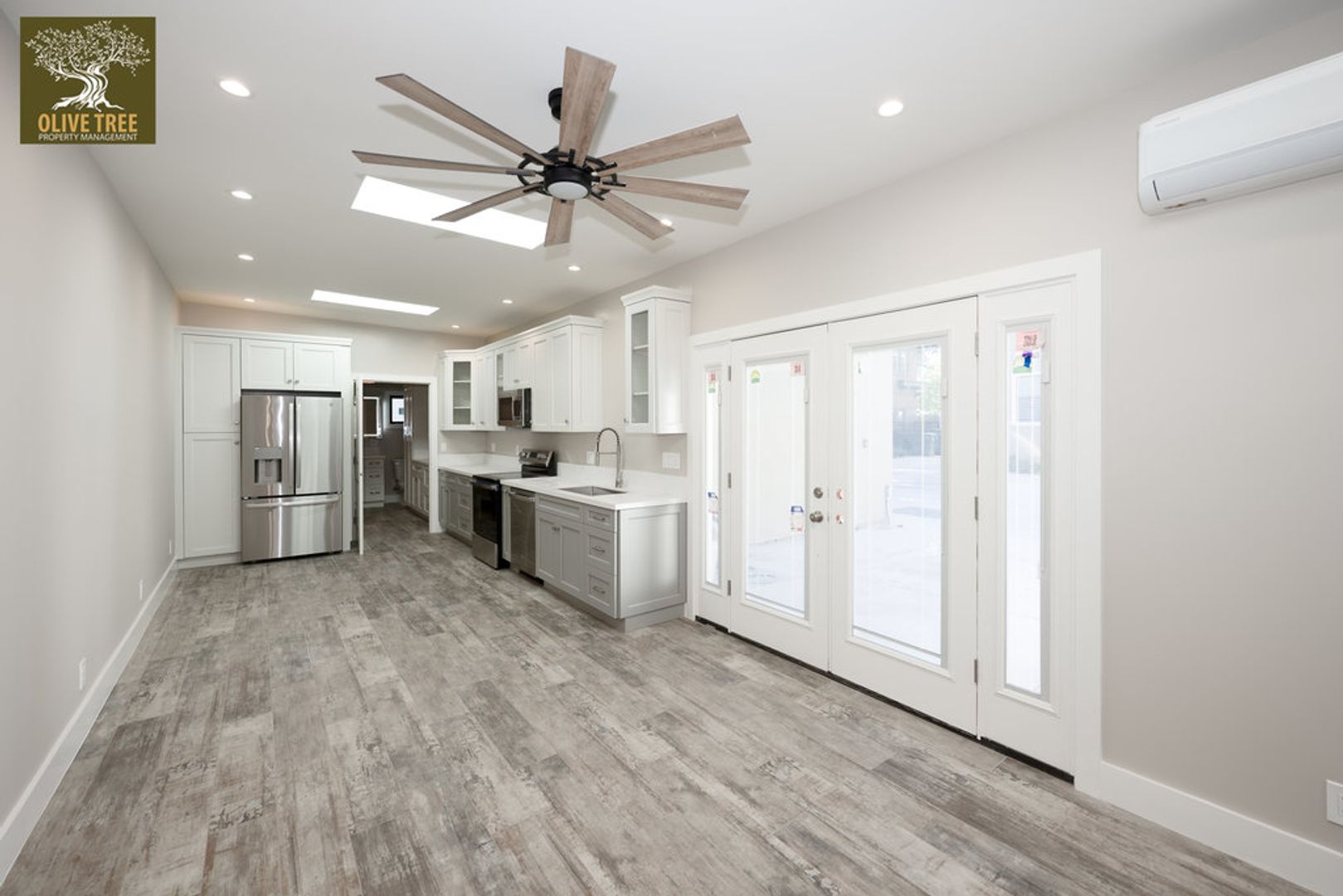 A bright, open-concept layout welcomes you in, with the living room enhanced by skylights that bring in abundant natural light. The kitchen is thoughtfully appointed with ample custom cabinetry, quartz countertops, and high-end built-in appliances—perfect for both everyday living and entertaining.